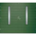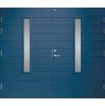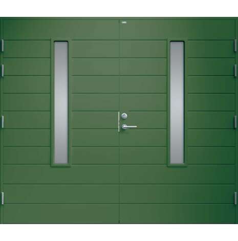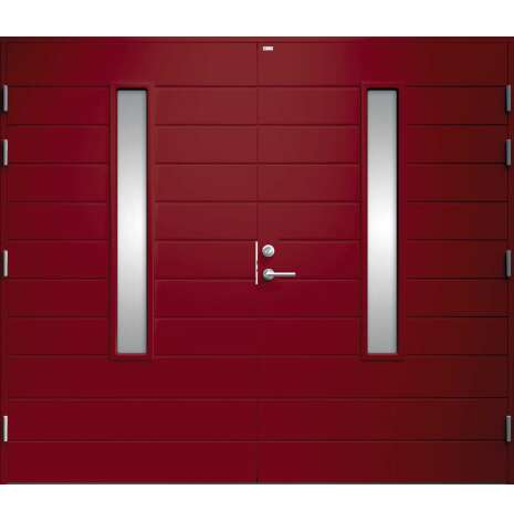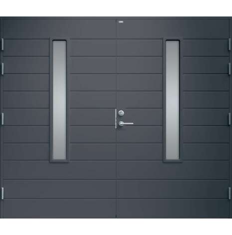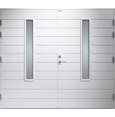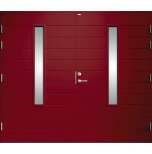 Garagedörr i modern stil med två stående klarglas och liggande dekor. Som standard är dörren Vit (NCS S0502-Y).