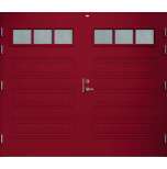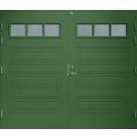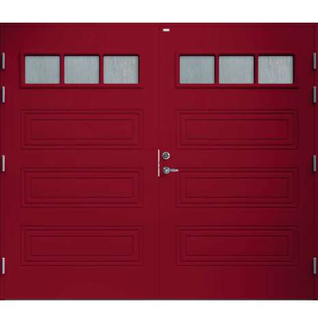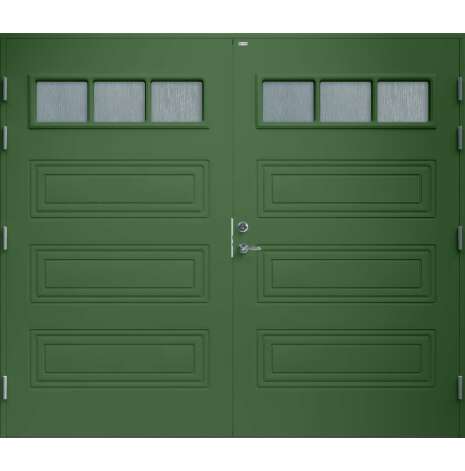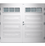Garagedörr i traditionell stil med speglar i form av spårfräst dekor, liggande cotswoldglas med dekorspröjs. Som standard är dörren Vit (NCS S0502-Y).