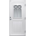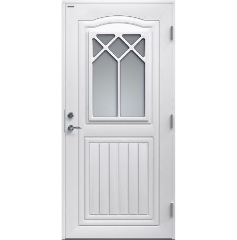 Linnea är en ytterdörr i traditionell stil och klarglas med karakteristiska dekorspröjs. Dörr och karm levereras vit NCS S 0502-Y som standard.
