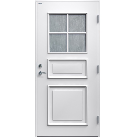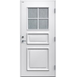 Elvira glas är en klassisk ytterdörr med dörrspeglar markerade med lister. Cotswoldsglas beprytt med dekorspröjs. Välj mellan valfri kulör eller konstteak. Insidan är slät, men går att få dekorerad som utsidan. Dörr och karm levereras vit NCS S 0502-Y som standard.