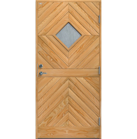 Karin Furu är en ytterdörr i traditionell stil med diagonal panel i form av spårfräst dekor samt cotswoldglas. Insidan är slät, men går att få dekorerad som utsidan.