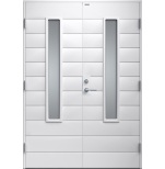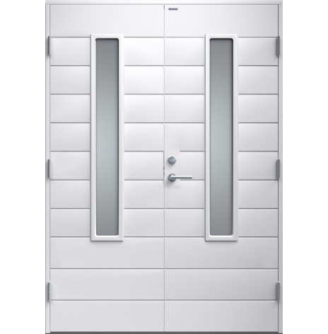 Clara är en parytterdörr i modern stil med stående klarglas och liggande dekor. Välj mellan ek, konstteak eller valfri kulör. Insidan är slät, men går att få dekorerad som utsidan. Dörr och karm levereras vit NCS S 0502-Y som standard.
