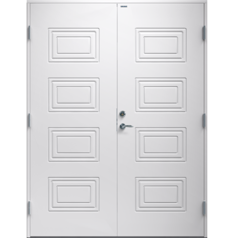Karina tät är en ytterdörr i traditionell stil med speglar i form av spårfräst dekor. Insidan är slät, men går att få dekorerad som utsidan. Dörr och karm levereras vit NCS S 0502-Y som standard.