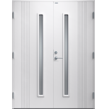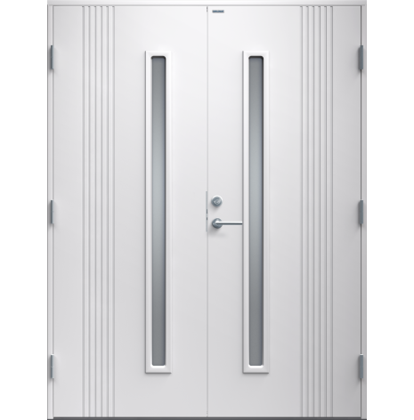 Natalie är en parytterdörr i modern stil med stående dekorspår och ett smalt, stående klarglas. Insidan är slät, men går att få dekorerad som utsidan. Dörr och karm levereras vit NCS S 0502-Y som standard.