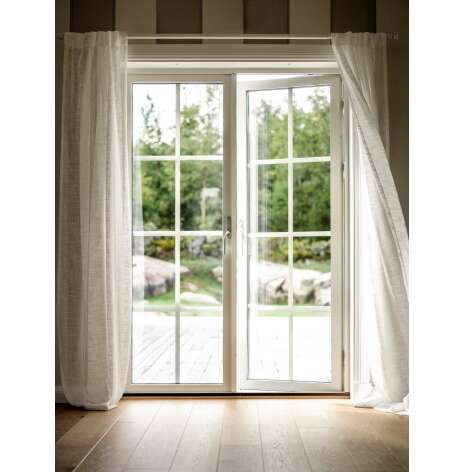 Elitfönster Orginal Alu 100 helglasad parfönsterdörr 3-glas med aluminiumbeklädd utsida. Dörren är vitmålat NCS S 0502-Y som standard, men kan även fås med laserad insida och ett antal standardkulörer på utsidan.