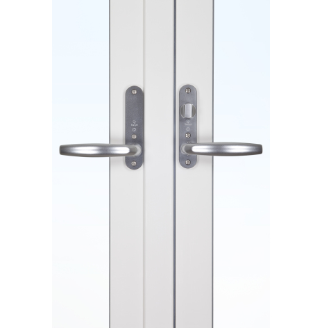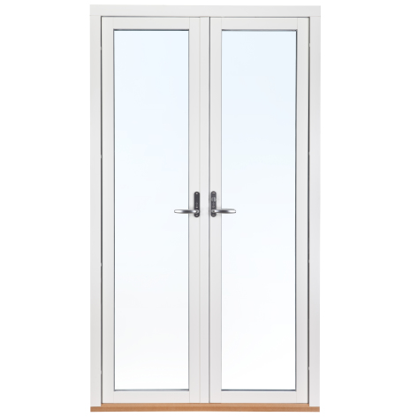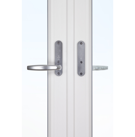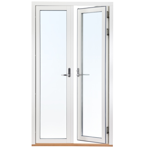 Fönsterdörrarna har en fallkolvsspanjolett på den aktiva dörren som gör att handtaget fjädrar tillbaka när du släpper det – precis som på en vanlig dörr. Säkerheten är mycket hög, men du kan, om du vill, uppgradera till en högre nivå. Dörren levereras som standard med låsvred på insidan, men kan beslås med olika låsalternativ, se mer under våra tillval.