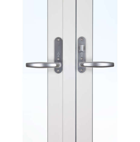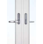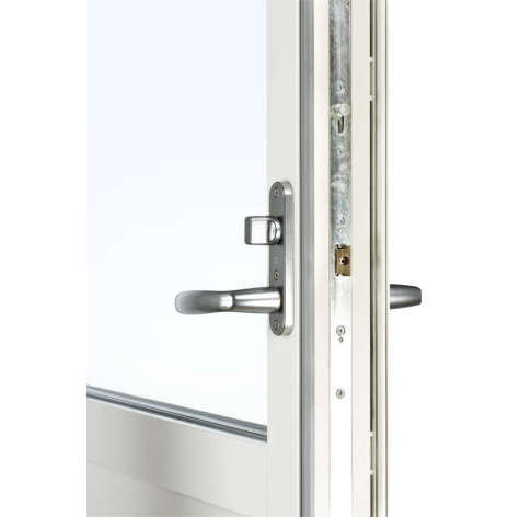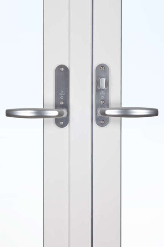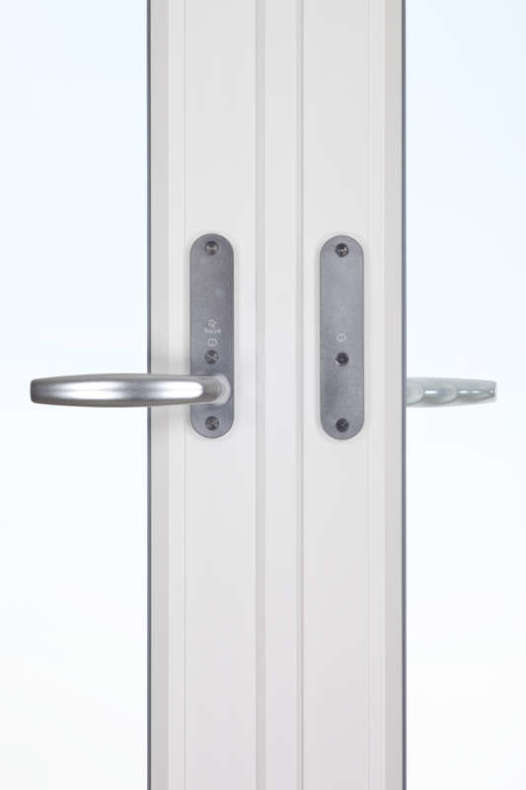 Fönsterdörrarna har en fallkolvsspanjolett på den aktiva dörren som gör att handtaget fjädrar tillbaka när du släpper det – precis som på en vanlig dörr. Säkerheten är mycket hög, men du kan, om du vill, uppgradera till en högre nivå. Dörren levereras som standard med låsvred på insidan, men kan beslås med olika låsalternativ, se mer under våra tillval.