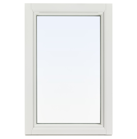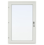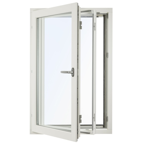 Sidohängt inåtgående fönster med kopplat 2+1 glas, dvs 2-glas isolerruta +1 enkelglasruta. U-värde 1,1. Barnsäkert handtag och låsanordning, fönsterbroms som tillval. Kan förses med spaltventil. Insida vitmålad NCS S0502-Y aluminiumbeklädd utsida i färgen Vit RAL 9010.